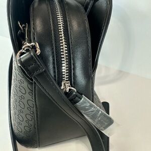 Stylish Guess satchel in sleek black. Features signature logo pattern. Perfect for daily use.