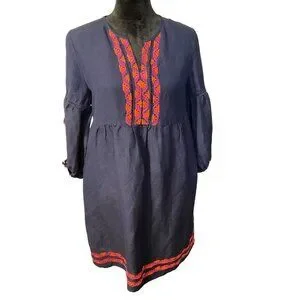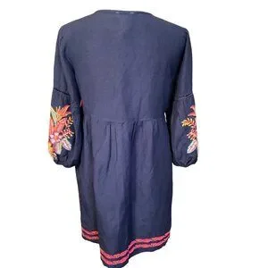 This charming bohemian dress captures the essence of vintage-inspired fashion with its detailed embroidery, rich navy hue, and colorful floral designs on its sleeves. Crafted from breathable cotton, it features a relaxed fit, making it ideal for comfortable wear while maintaining a touch of elegance. The intricate red and pink embroidery adds a playful yet sophisticated aesthetic that is both timeless and versatile.