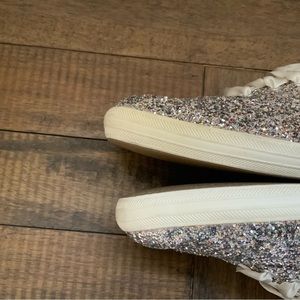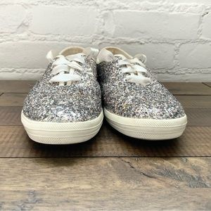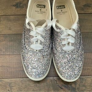 Sparkling silver glitter sneakers. Lace-up design. Comfortable and stylish.