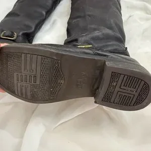 Stylish over the knee boots. Sleek black leather. Buckle accents for added flair. Perfect for any occasion.