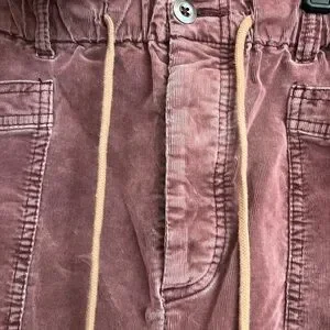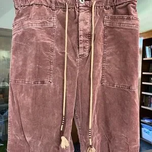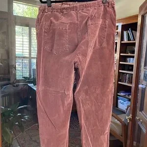 Soft and cozy corduroy pants with a button fly and drawstring waist. Pinkish mauve color, great for fall. Boyfriend fit with plenty of stretch tons of pockets.