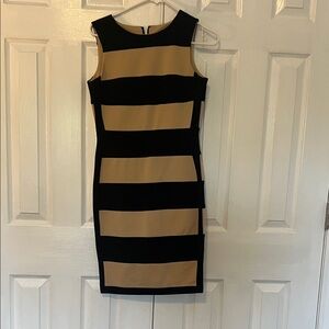 Chic midi dress with bold black and tan blocks. Perfect for a stylish statement.