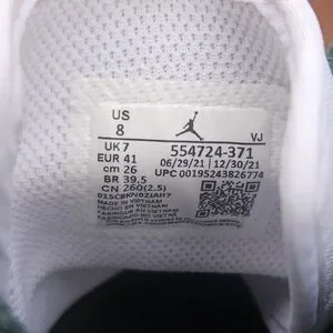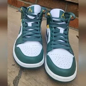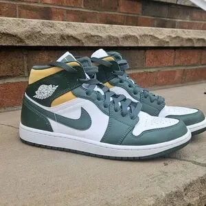 Stylish Nike Air Jordan high-top sneakers. Features green and white with yellow accents. Perfect for a sporty look.