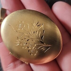 Elegant gold toned vintage locket pendant with floral engraving. Perfect for holding cherished memories. Approx 2.25" by 1.25"- normal age related wear- good vintage condition