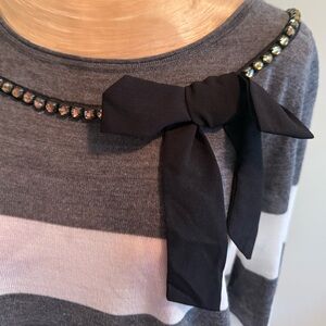 NWT’s Chic charcoal knit sweater. Ideal for any season. Tinted rhinestones and a black bow accentuate the neckline