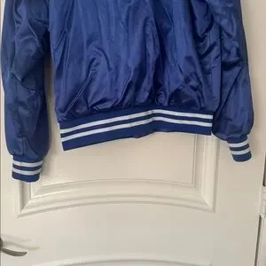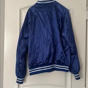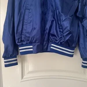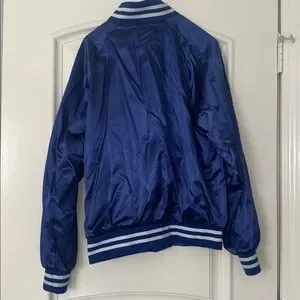 Vintage-style Augusta Sportswear Royal/White Jacket (Style 3610) in Size Medium. Classic athletic silhouette with bold contrast striping and shiny satin finish — a standout piece for sports fans, retro streetwear lovers, or casual everyday wear.