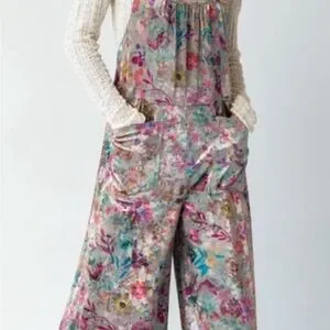 Chic floral jumpsuit with vibrant colors. Features wide legs and handy pockets. Perfect for casual outings.