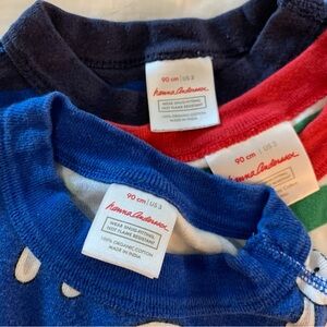 Six piece long sleeve pajama bundle by Hanna Andersson in a size 3 Y. Three long sleeve and three pairs of bottoms. The green top has some faint staining on the white parts.