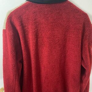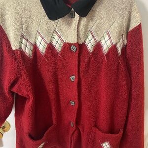 Elegant Teddi jacket in burgundy and cream. Black collar with quilted Diamond pattern. Excellent Condition.