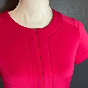 This stunning Shoshanna dress in a vibrant pink hue is perfect for a cocktail night out. It features an asymmetrical hemline with a stylish side slit, a plunge neckline, and short sleeves. The sheath silhouette and mandarin collar add a touch of elegance to this mini dress.