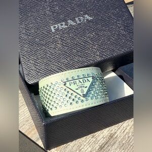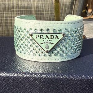 Chic mint green cuff adorned with crystals. Features iconic Prada emblem.