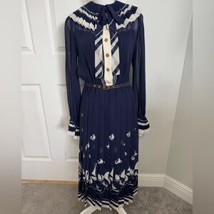 This elegant navy blue dress features a charming sailboat print, perfect for any occasion. The sheer sleeves and pleated skirt add a touch of sophistication. Ideal for those who love nautical themes.