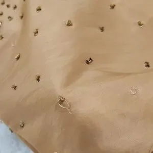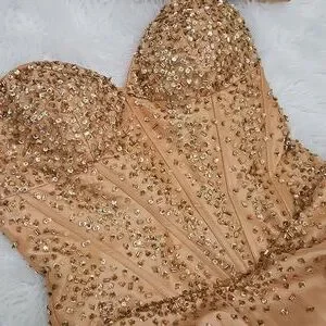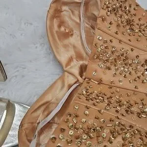 Elegant gold strapless dress with matching scarf. Features sparkling embellishments.