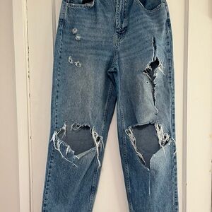 Trendy light blue jeans with a relaxed fit. Features heavy distressing for a bold look. Perfect for casual outings.
