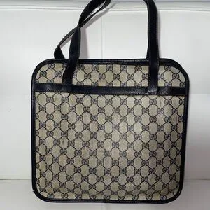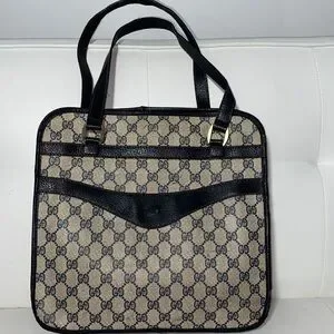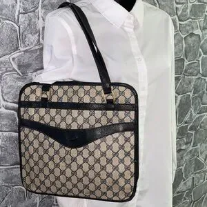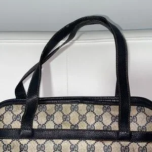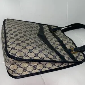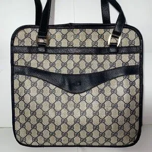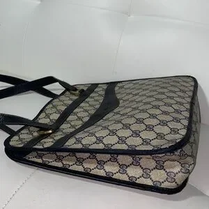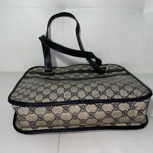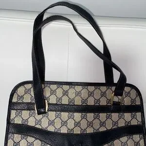 Elegant Gucci shoulder bag with iconic monogram pattern. Features black accents. Ideal for any occasion. Authentic vintage Gucci - emblem missing, priced accordingly - perfect for restoration or creative customization project.