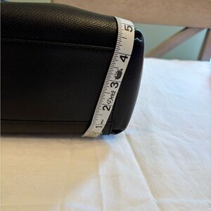 Sophisticated black leather satchel by Coach. Features dual handles and gold accents. Perfect for stylish outings. Gently used, one scratch on side ( in pics). This bag has so much room. There are 2 zippered pockets and 2 magnetic snap pockets. Additional adjustable strap for shoulder or crossbody carrying. This is a beautiful, spacious bag especially good for carrying back and forth to work.