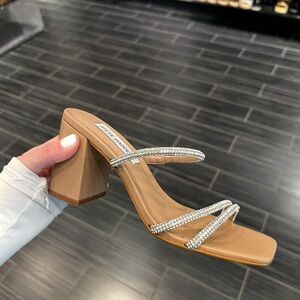 Stylish Steve Madden sandals with a beige base. Features dazzling rhinestone straps. Perfect for any event. Never Worn