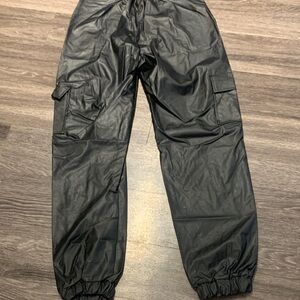 Black Faux Leather Cargo Pants with Smocked Waist & Ankles – Size Medium NWOT