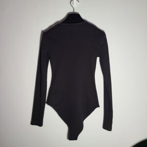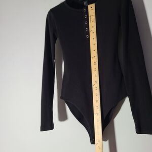 Chic black bodysuit with button-up detail. Long sleeves for a sleek look. Gently worn but in good condition, cotton or cotton blend.
