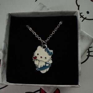 Adorable Hello Kitty jewelry set. Silver necklace with matching earrings. Features pink, white, red, and blue accents. Ideal for fans.