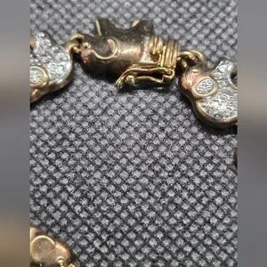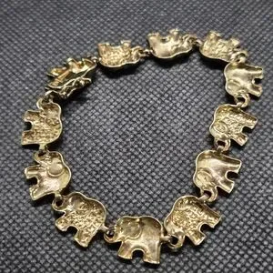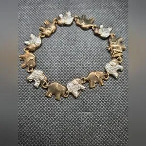 Adorable elephants range in color from antique goldtone to a copper shade to a pebbled silvertone. Bracelet is in good used condition and has an insert clasp. It is marked PAJ BR CHINA.