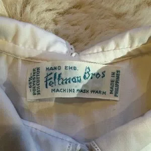 Vintage baby dress from 1980s. Clearly high end at the time with hand-embroidered smocking in a blue bead shape. Button down front. Large generous sash for a nice big bow in the back. Sleeve and collar have picot trim.
