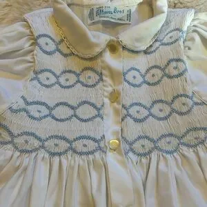 Vintage White Smocked Blue Embroidery Baby Dress with picot trim and sash