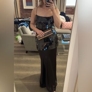 Stunning brown gown with shimmering sequins. Perfect for formal events. Worn once and professionally dry cleaned.