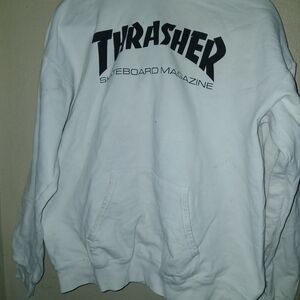 Thrasher white hoodie with bold logo design. Comfortable and stylish.