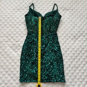 This eye-catching homecoming dress dazzles in dark emerald green fully embellished with sparkling sequins that catch the light from every angle. Its figure-hugging silhouette features a corset-style bodice with delicate spaghetti straps and a flattering sweetheart neckline, offering both support and sophistication. The mini-length skirt is richly adorned for added elegance, while the overall look is enhanced by intricate floral detailing throughout. The back mirrors the elegant corset design, securing the look and ensuring comfort for all-night wear. Perfect for making a dramatic entrance, this dress is ideal for homecoming, prom, or any special evening occasion where you want to stand out and shine.