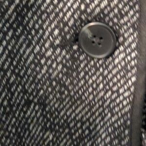 Medium weight black and grey striped jacket with double breasted styling.