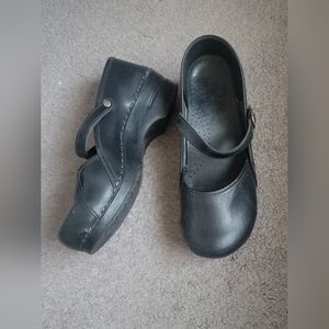 Elegant black dress shoes by Sanita. Features a secure strap for easy wear. Perfect for formal occasions. A small scuff mark on the toe of the right shoe