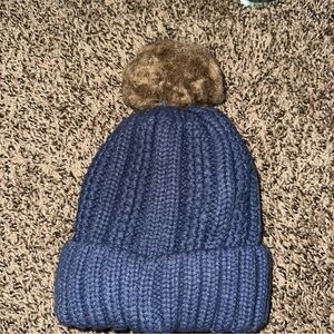 Stylish navy knit hat by C.C. Features a cozy tan pom. Ideal for cool weather.