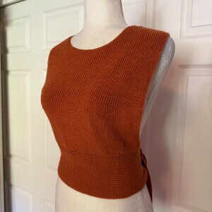 This Free People top in size M features a solid rusty orange color with a boat neck and sleeveless design. Made of polyester, cotton, and acrylic knit fabric, it has a tie closure and a cropped style. Ideal for travel or casual wear, this breathable blouse exudes a beachy and bohemian vibe, perfect for the summer and spring seasons.