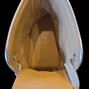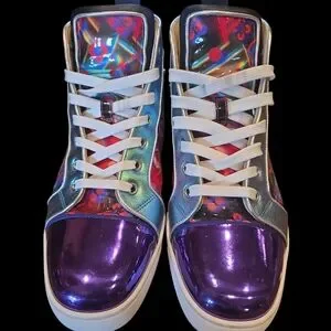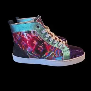 The sneakers in the image are the Christian Louboutin Louis Orlato Flat 'Version Multi'. These are high-top sneakers with a multicolor collage pattern on patent leather and suede materials. The shoes also have white calf leather material and the brand's signature red rubber soles. These sneakers are sometimes described as having a "Love" print throughout.
