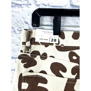 Introducing the PacSun Dad Jean in white chocolate peace love design. These jeans are made of 100% cotton denim fabric, which makes them comfortable and easy to care for. The 5-pocket design includes a button and zip closure, with accents like buttons and a logo. The straight leg fit has a high rise waist of more than 10.5 inches, making them perfect for any season. These jeans are machine washable and have a medium wash. The inseam measures 30 inches, and the waist size is 28 inches. The PacSun Dad Jean is a great addition to any festival, hippie, dad, peace, or boho themed outfit.