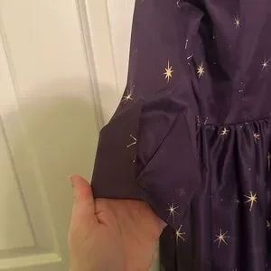 Fun and twirly Halloween season dress from Lindy Bop with a pattern that features moons and witches on broomsticks! 3/4 sleeves with cuffs and wrap style collar. Has belt loops but is missing its original belt. Excellent used condition otherwise, with no flaws or signs of wear. Size UK 16 or US 12. Measurements available upon request.