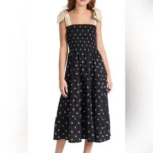 Fabric: Mid-weight, non-stretch weave. Smocked elastic bodice. Self-tie adjustable taupe shoulder straps. Floral print. Square neckline.