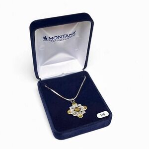 Celebrate the history and legacy of Montana Silversmiths with this beautiful pendant necklace. Adapted from a previous Montana Silversmiths design, this piece is classic and timeless, making it perfect for your collection. The two tone pendant features a gorgeous Southwestern design that secures to a 20 inch silver tone chain. This design features a silver tone square with a cross through the center, and a gold tone flower sits in the middle of the cross. Four gold finished fans add to the design while deep black details create a more dramatic look and complete the beautiful design.