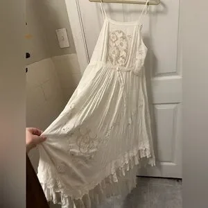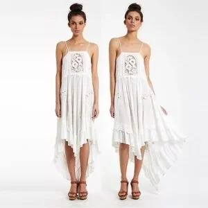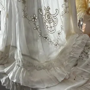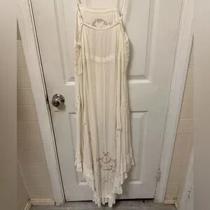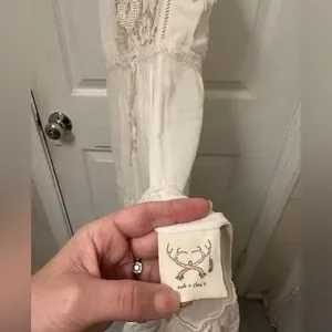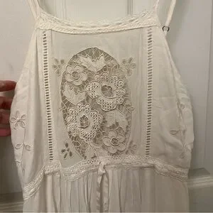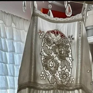 I cannot find any flaws in this stress if there are any they are not visible to me. It is not new with tags, but I don’t know if anyone ever wore it. I did try it on, however, and the extra small I believe is more about the length and it is about the size of the width. It has a very ample waist which can be cinched with a ribbon and it is very floaty at the bottom with the high low hem. I think it could fit a small as well as an extra small one detail about the extra small is that the bottom of the lace oval is cut off a little bit but this is only for the extra small. If you see one of these with a cut off oval that is not an extra small it is an imitation