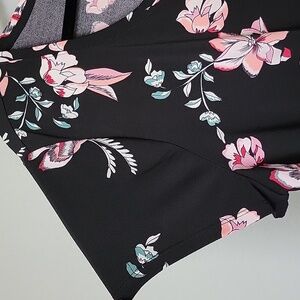 Black with pink and white florals all over. Short sleeves. Twisted at the bottom. Great condition. girly, garden, dainty, romantic, dinner, date night, brunch, church, office, workplace, moody , curvy, plus, fall, autumn