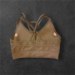 Stylish and supportive strappy sports bra. Ideal for workouts and everyday wear. Soft tan color enhances your activewear look.
