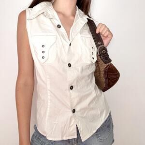 clio white cargo vibe button up top with cool details! has small stain on the front shown in photo! size 12 ptp- 20-23”