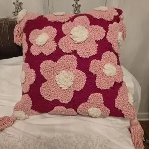 The Blossom Flower Pillow features a vibrant floral pattern with a tasteful combination of pink and red hues and handmade pink tassels to add playful touch. The vibrant colors bring life to any room, while the tufted, three-dimensional detailing adds a sophisticated texture to the overall appearance. Made from 100% organic cotton, this decorative pillow is extremely soft and a great addition to enhance a living area. Due to their handcrafted nature, each pillow will be unique.