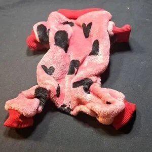 Cozy pink pet sweater with black heart patterns and red cuffs. Perfect for keeping your pet warm and stylish.