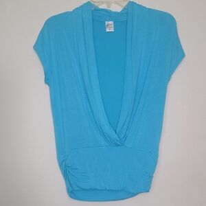 🌊 Happie² Sky Blue Drape Front Blouse Size S Soft Stretch Rayon Deep Cowl Neck
