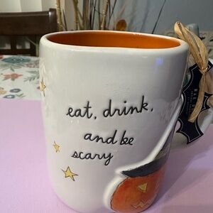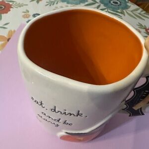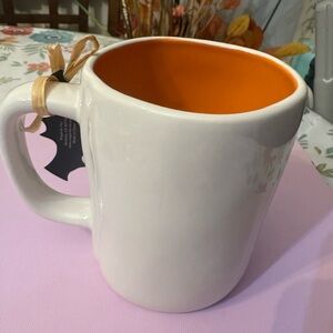 Celebrate Halloween with this Rae Dunn mug. White exterior with orange interior. Perfect for spooky drinks.