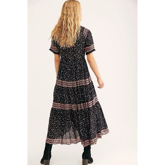 Effortless floral print maxi dress featured in an a-line silhouette with a tiered pleated skirt, button-up neckline and ruffled trim. Lined skirt adjustable tie waist sheer top. 100% Viscose,100% Cotton Lining. Size XS. Good preloved condition