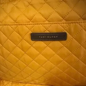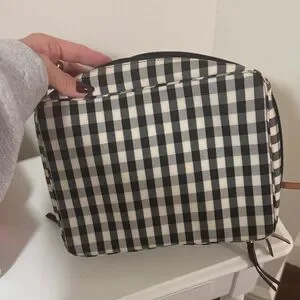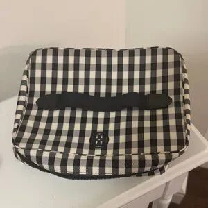 Chic gingham pattern. Iconic Tory Burch emblem. Ideal for cosmetics.