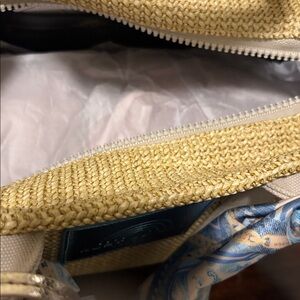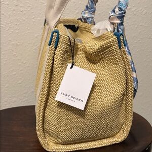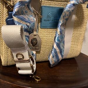 Stylish beige tote bag with blue accents. Perfect for any occasion.two ways to carry long straps and short straps 12.9in (H), 16.9in (L), 6.2in (D)